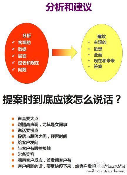 怎么做提案? 2013/05/14 INHAO Leave a comment ❶建议提案最好分4部分:引言/分析/建议/总结❷建议时间比例安排:引言(10-15%)+分析(40-50%)+建议(35-45%)+总结(5-10%的时间)❸提案时到底应该怎么说话?(如图)❹成功的方案=独特的+能计算出来的+可实现的+合理的+对准目标的! 生成海报 下载海报 您可能也喜欢以下内容: 2020东京奥运会,日本为各国绘制的动漫形象 潮流情趣商城AGESHOP发布ios应用布局移动平台 维珍航空正式推出飞机机内勾搭服务阿! 网站首页12大元素 如果消除消费者不满情绪? 深度疯狂解密——屈臣氏最重要的陈列系统:VAS 一张价值120万的图,告诉你微博运营的所有秘密! 6个CEO最关心的营销指标 年终大放送~本人整理的移动端app设计指南信息图一张~~~欢迎转发~~ 《经济学人》常用词汇总结 我眼泪都流出来了 太珍贵了 !!周末在家,给自己冲冲电吧!