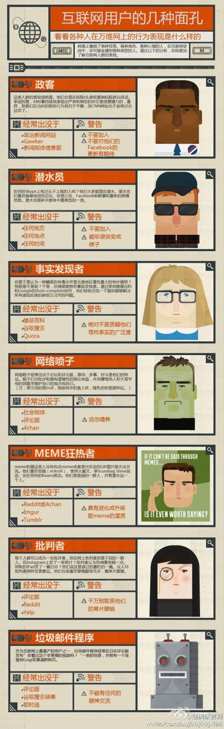 互联网用户的几种面孔 2013/07/28 INHAO Leave a comment 政客、潜水员、事实发现者、网络喷子、MEME狂热者、批判者、垃圾邮件程序,在网络世界里,他们经常出没于哪里?另附警告请注意查看! 生成海报 下载海报 您可能也喜欢以下内容: 你可能看了一部假的生化危机:终章 皮卡丘的诞生经历,原来在现实世界真的有一个小智(图片多请耐心加载) Today’s ranking of the world’s richest people 增肌 开车技巧篇 那些年网络上的最后神回复! 灰常全面的excel表格公式! 98平原木家居,清爽美家~