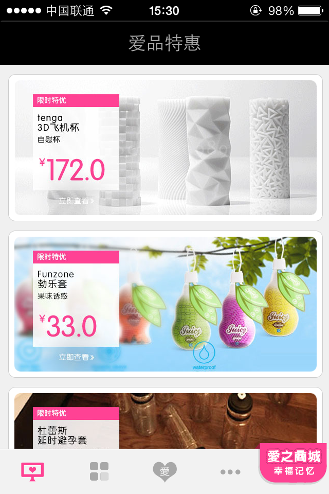 潮流情趣商城AGESHOP发布ios应用布局移动平台 2013/10/04 INHAO Leave a comment AGESHOPS爱之商城是AGENEED旗下的b2c情趣爱品平台,定位于为异地恋的夫妻解除后顾之忧,准妈妈的幸福生活提供解决方案,帮助消费者杜绝外遇。 商城现有675件情趣爱品,这次发布的iosapp主要包括: -云收藏:将喜欢的爱品加入云收藏,方便日后购买。 -爱品特惠:正品优品,限时低价,促销信息不错过。 -订单状况:随时随地掌握最新订单状况。 相关网址:http://www.ageneed.com/index/?p=149 生成海报 下载海报 您可能也喜欢以下内容: [评测]《爱之商城》潮流情趣成人用品商城APP! 腾讯发布80页重磅报告:哪些行业将被颠覆 你可能看了一部假的生化危机:终章 Today’s ranking of the world’s richest people 为每只流浪的小猫小狗做一个logo 2020东京奥运会,日本为各国绘制的动漫形象 怎么做提案? 维珍航空正式推出飞机机内勾搭服务阿! 网站首页12大元素 如果消除消费者不满情绪?