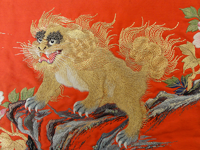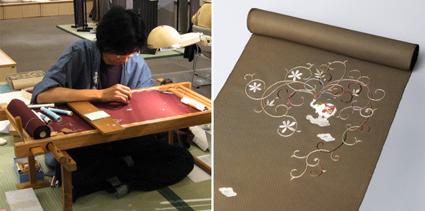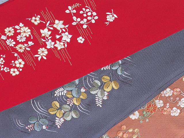 布料装饰的刺绣常用来表现和服的华丽,也用于相扑选手缠于腰间的缎带,亦是木偶人形的奢华衣装,古时也常出现在武士的甲胄上。作为历史悠久的传统手工艺与各地风俗不无关系,日本刺绣也依照产地被命名为“京都的京绣、金泽的加贺绣、东京的江户绣”,其中京绣与加贺绣受到日本传统工艺的认定并加以保护和援助。京绣是从建造“平安京”时设立的“织部司”中专职刺绣的职人开始,逐步脱却奈良时代来自中国的影响,渐渐形成日本独自的技法。直至江户中期宫崎友禅斋完成友禅染前,仍是布面上加以装饰的重要技法之一。在绢织物,麻织物上施以金银线的传统工艺,绘画般的纹样表现,无不飘散着京都特有平安遗风下华丽贵雅的馨香;加贺绣源自室町时代佛教向加贺一带布教时,僧侣身着的袈裟以及佛绣品,京都的庄严装饰也随之传来。出于加贺藩主对工艺文化的嘉奖和保护,加贺金箔、加贺友禅后加贺绣也得以重视,到江户时代已经是将军、藩主手持小物、和服等处常见的装饰了。加贺绣除金银线外,多样多色的丝线手工绣制纹样,华丽中不失温和而成为最大特色;江户绣在江户时期经济繁盛的推动下,延续奢华的作风,幕府虽三令五申的强化管理禁止奢靡,却没能阻止人们对于简素的厌倦,同多彩的染色技术一道,绚烂多姿的绣品逐次诞生,江户绣也因此倍加推广,讲究纹样构图与空间的协调成为最大的特征。