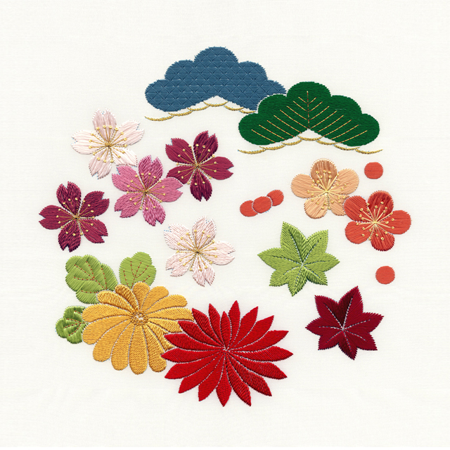 日本刺绣汲取来自中国的技术后,结合独自对的美的意识同优雅形成日本风格。传统生活习俗中培育出各式图案与纹样,将家纹绣于和装服饰上的传统亦流传至今。尤其是对四季变换的感性体察,诞生出多样的装饰纹样。天象、花鸟、唐草,甚至来自西洋纹样的影响皆成为装饰的题材。春的樱花、紫藤、牡丹;夏之牵牛花、锦葵、泽泻草;秋的胡枝子草、菊、红叶;冬之山茶、水仙、梅花、松等,无不显现对变幻时光的深切且细腻的感知,而季节感也为人们的生活增添多姿的色彩。刺绣的色彩源自丰富的丝线,釜染色的丝线曾有上千色之多,经历现代染色技法也有万色变化,可谓风情万种。