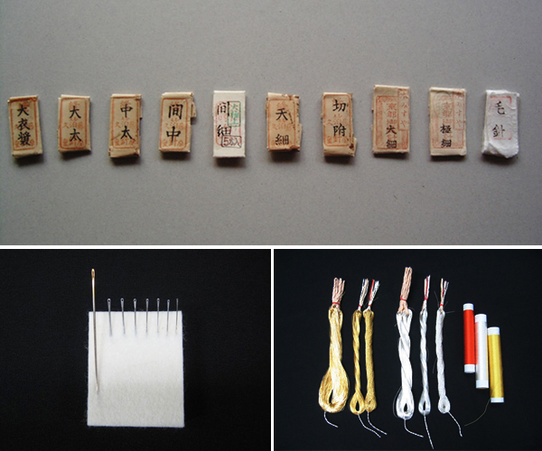 刺绣是绣针与彩线交织的艺术,绣针以前多为手工打制的高级品,所谓铁杵磨成针的工夫不无可能,穿线处平滑,针尖则锐利有度,依照粗细程度还可分成“大衣奖,大太,中太,间中,间细,天细,切付,大细,极细,毛针”等(日文中“太”意为粗)。使用的彩线通常为丝质“釜线”,此乃使用釜染色的绢线, 4~12根极细的绢丝成束,未经捻搓而成,散发出丝质原本的光泽。此外还有从蚕茧直接缫丝,约9根为一束做“生线”亦称“原线”;再将生线精简去除杂质后叫做“绢线”。绣品最怕磨损,为解决这一问题,也将丝线捻搓后增加强度来使用,揉捻的强弱可决定纤维的光反射,绣品也会因此而产生极其微妙的变化,还有将不同色彩的丝线捻搓成股,用以表现幻化的多彩工艺。此外绣台也是常用的道具,将织料绷在木制台架上,左右夹制固定,上下边幅用线缝制固定。当然,剪断丝线的“绣铗”,纺线用的木制“纺机”,绕线的“竹管”,插竹管的木“蜻蜓”,缠绕粗线的“驹木”等也是必不可少的刺绣装备。