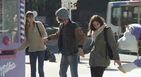 接下来的这个自动贩卖机由阿根廷巧克力公司Milka打造,机器里头的巧克力全部免费,不过想拿到可并不容易,需要召集群众一同牵手,让远处的牛牛与贩卖机相连才会激活,而且每成功一次,牛牛就会移动得更远。