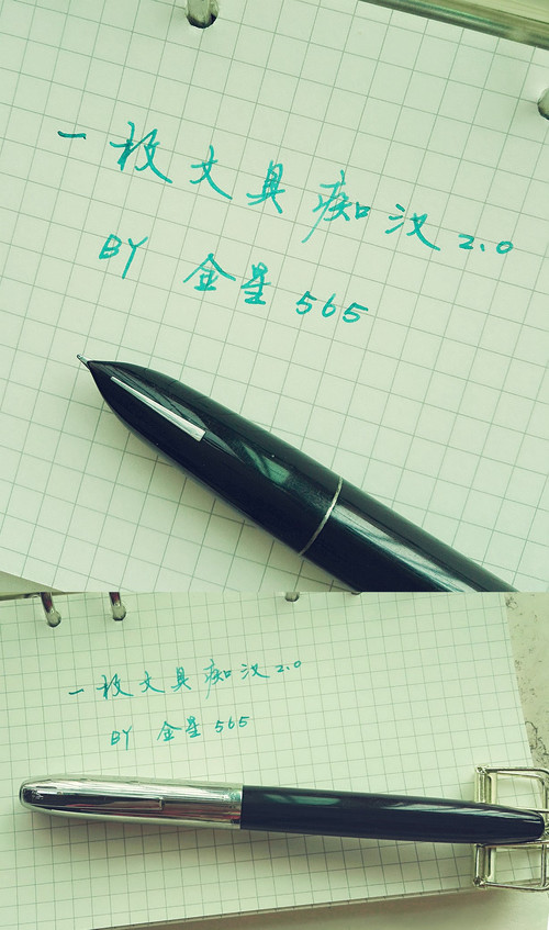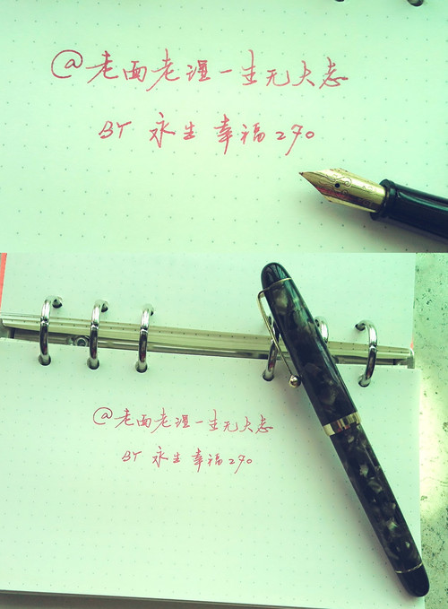 特点:磨砂笔杆很有质感,但笔身并不沉重,明尖设计,实际书写粗细在0.4mm左右,出墨(蘸墨基础上)流畅,出锋不及永生的包尖,不过也不错