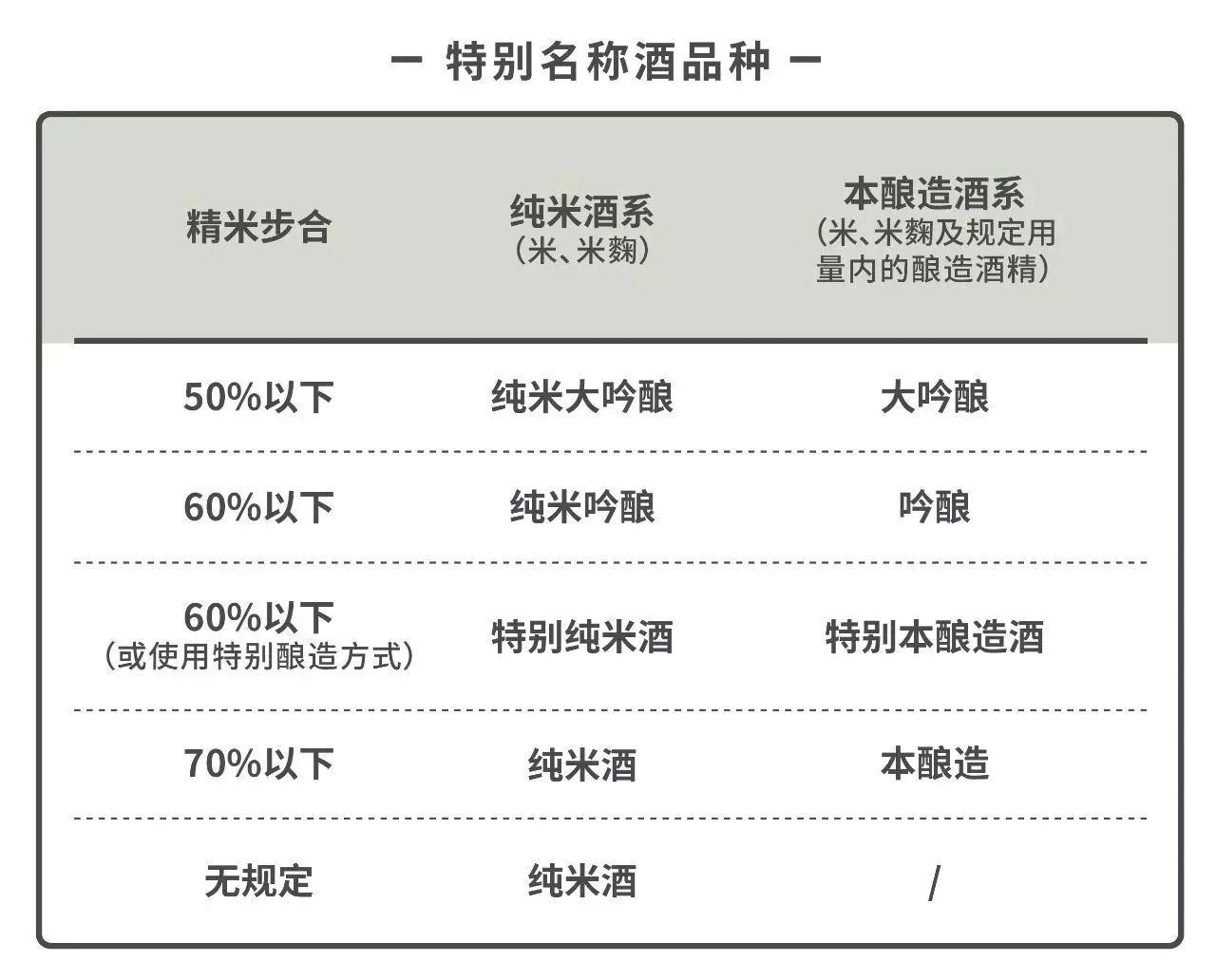 根据精米步合比率,特别名称酒还可以进一步细分如下: